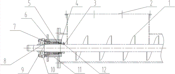 本技術(shù)新型涉及 螺旋輸送機(jī) 輸送領(lǐng)域,具體屬于應(yīng)用于食品、化工、醫(yī)藥、糧食行業(yè)的螺旋輸送機(jī)防漏粉軸承密封裝置。 背景技術(shù): 在化工、食品、醫(yī)藥、糧食行業(yè),物料都需要有距離的輸送,螺旋輸送機(jī)是在這種情況下常用的輸送方式?,F(xiàn)有的螺旋輸送機(jī)在使用時(shí),常出現(xiàn)兩端密封座因密封不嚴(yán),密封端物料泄露嚴(yán)重漏料,泄漏物滲入軸承內(nèi),就會(huì)造成螺旋輸送機(jī)運(yùn)轉(zhuǎn)一段時(shí)間軸承座的軸承便會(huì)卡死。同時(shí)也會(huì)造成物料浪費(fèi),污染環(huán)境。 技術(shù)實(shí)現(xiàn)要素: 本技術(shù)的目的是提供一種螺旋輸送機(jī)防漏粉軸承密封裝置,為化工、醫(yī)