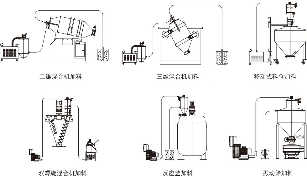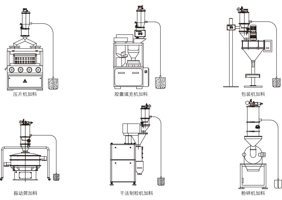 真空上料機(jī)是利用真空發(fā)生器作為真空源的一種真空輸送機(jī),利用該真空加料機(jī)可以將物料從容器中直接送入混合機(jī)、反應(yīng)器、料斗、壓片機(jī)、包裝機(jī)、振動(dòng)篩、整粒機(jī)、濕法制粒機(jī)、干法制粒機(jī)和粉碎機(jī)中去。該機(jī)減輕了工人的勞動(dòng)強(qiáng)度,杜*了粉塵污染,保證生產(chǎn)符合“GMP”要求。